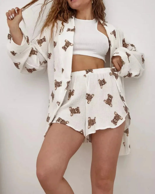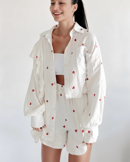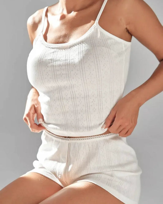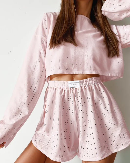 Różowy krótki komplet odzieży domowej z delikatną koronką